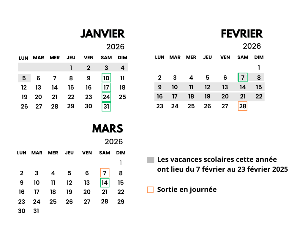 Nous proposons 8 sorties en journée (à partir du niveau bronze et collégiens)